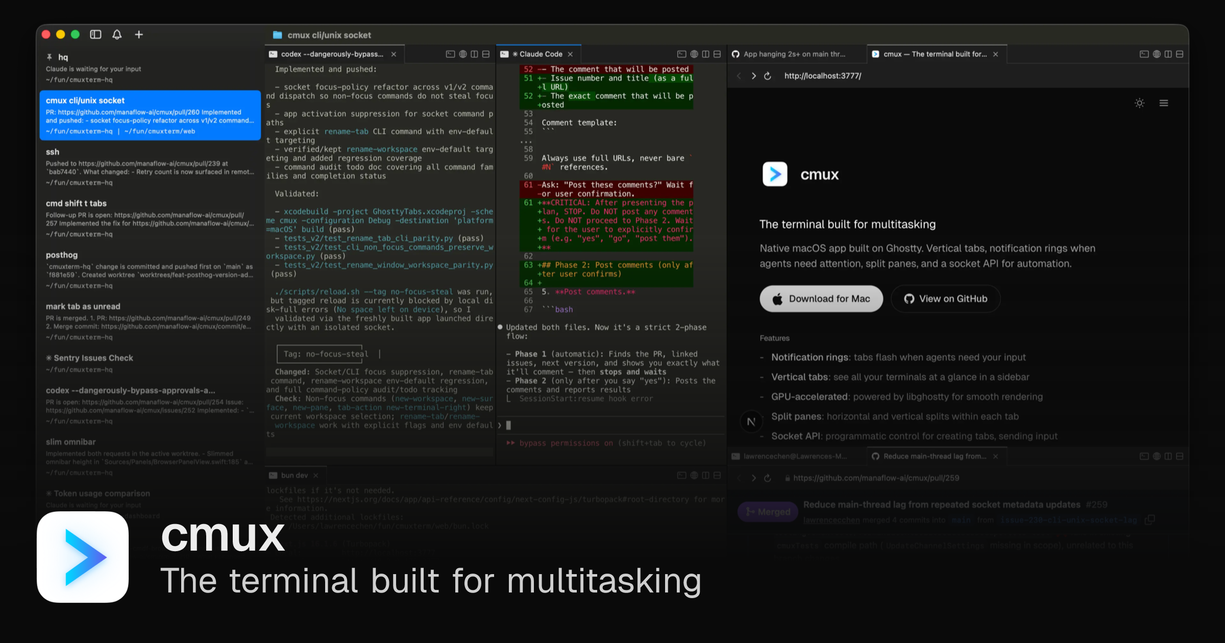 cmuxは、単一のターミナルウィンドウ内で複数のセッションを管理できる強力なツールです。これにより、各セッションを独立したプロジェクト環境として扱い、AIエージェントの実行状況をリアルタイムで監視したり、異なるプロジェクト間を容易に切り替えたりすることが可能になります。