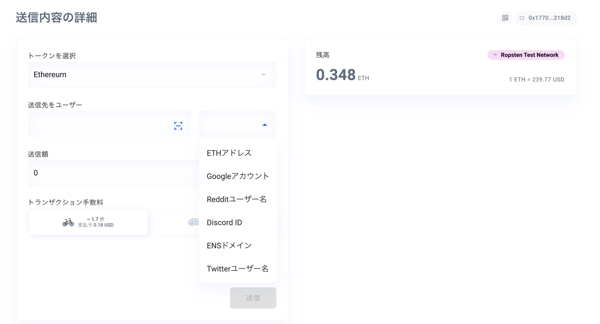 相手先のTwitterアカウントやGmailアカウント等を入力するだけで、簡単にイーサリアムを送金することができるサービス。